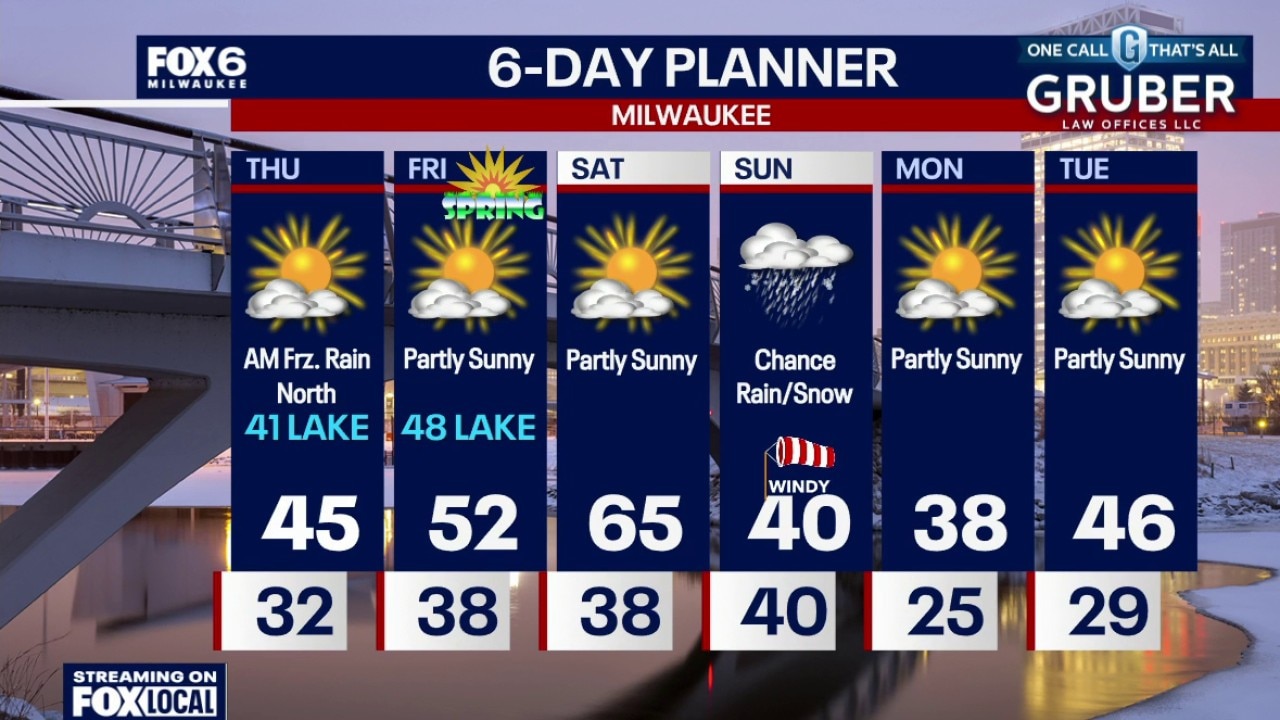 Mostly cloudy tonight with a chance for freezing rain overnight, mainly north of Milwaukee. Slick spots are possible. Temperatures will be in the low-to-mid 30s tonight. Early AM freezing rain possible north of Milwaukee, ending by 7am. Becoming partly sunny. Highs in the low 40s near the lake, mid-40s inland.