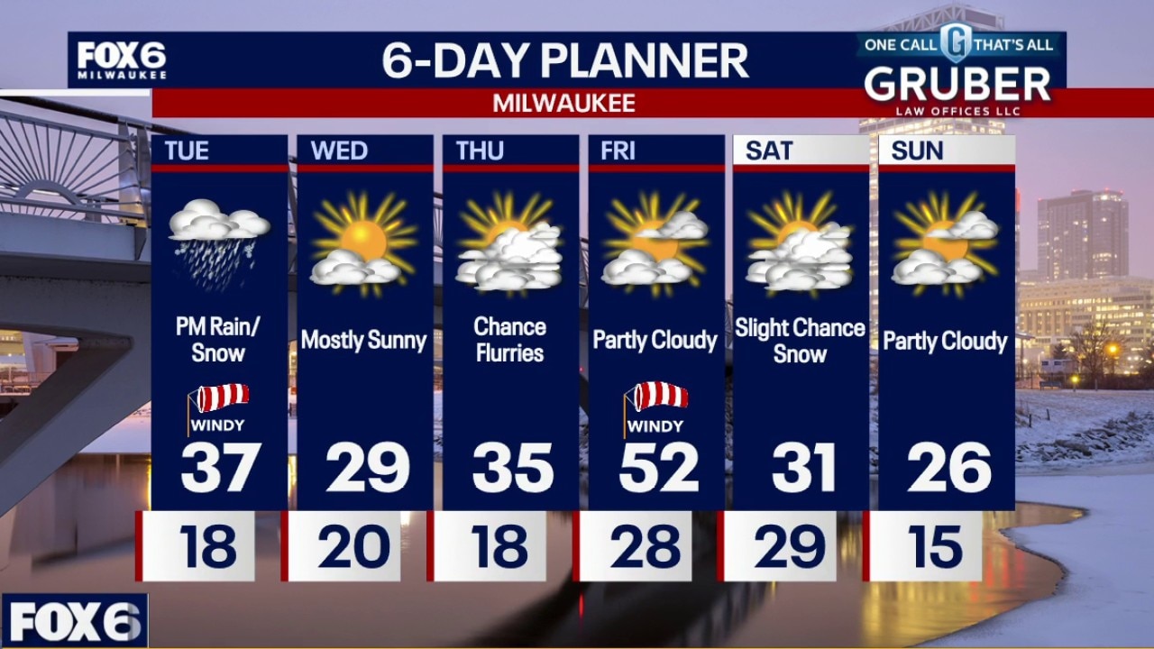 Windy on Tuesday and warmer with highs in the upper 30s. Snow moves in after 2pm (possibly some rain mixed in). This will impact the evening commute with low visibility. Around 0.5" of snow is possible with a quick-moving band from northwest to southeast.