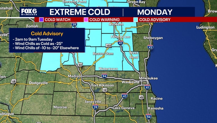 MILWAUKEE - Dangerous cold settles in tonight and Tuesday morning, thanks to a strong northwest wind and mostly clear sky. Air temperatures will drop into the single digits above and below 0 tonight with wind chills of -10 to -25°.