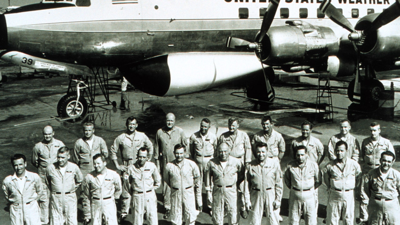 A 1966 photo of the crew and personnel of Project STORMFURY, an experimental program by the US Government to weaken tropical cyclones using silver iodide. Credit: NOAA
