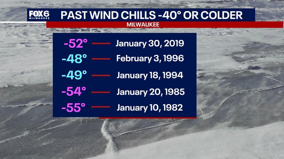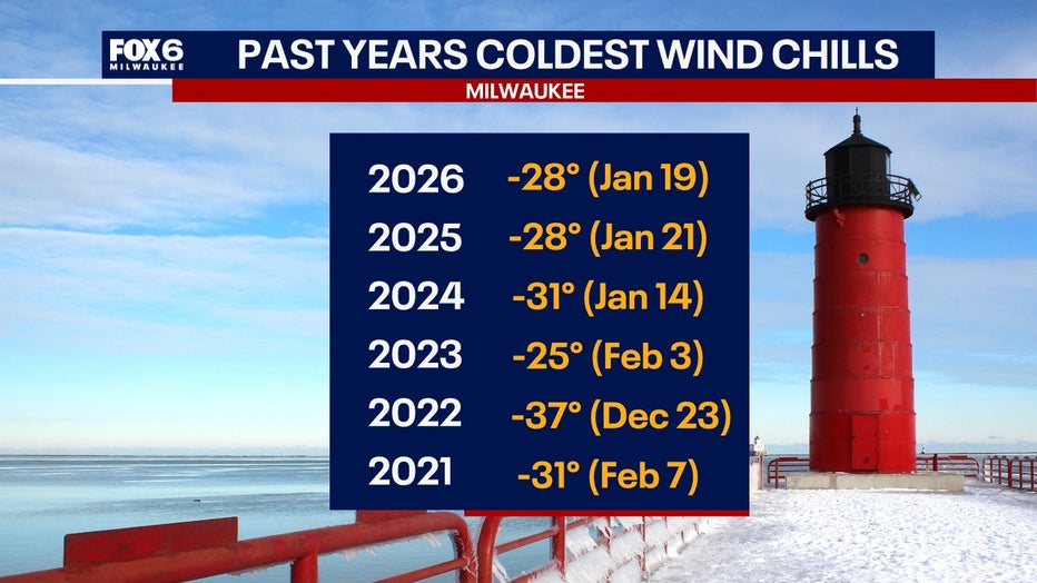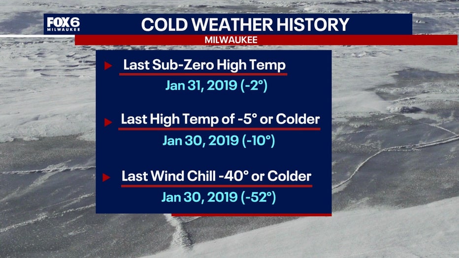 Despite the dangerous wind chills that will arrive on Friday, high temperatures will also be in the negatives, which isn't too common for Milwaukee either. 2019 was the last time air this cold reached the upper Midwest.