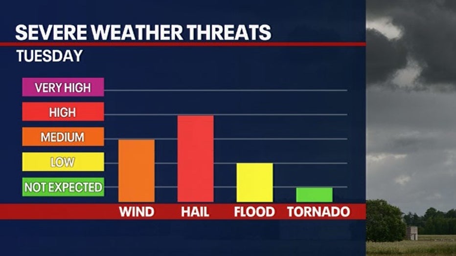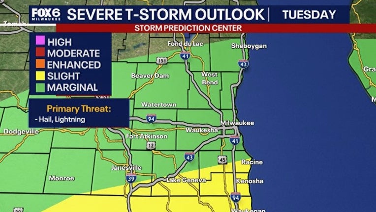MILWAUKEE - Thunderstorms are possible between on Tuesday evening, March 10. Some may be strong with large hail, mainly south of I-94.
