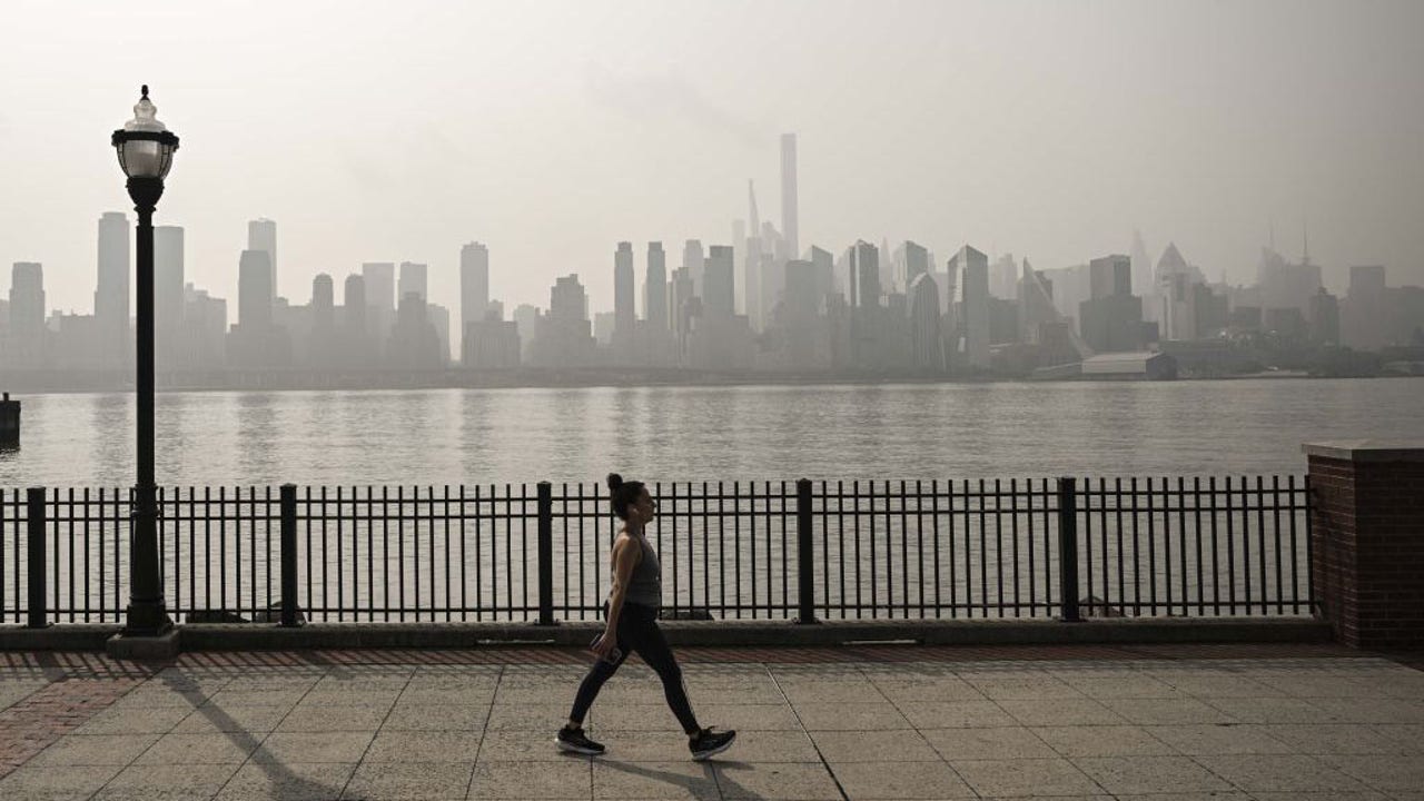 People carry on with their daily life as the air quality is at unhealthy levels due to smoke from Canadian wildfires in New York, United States on June 30, 2023. (Photo by Fatih Aktas/Anadolu Agency via Getty Images)