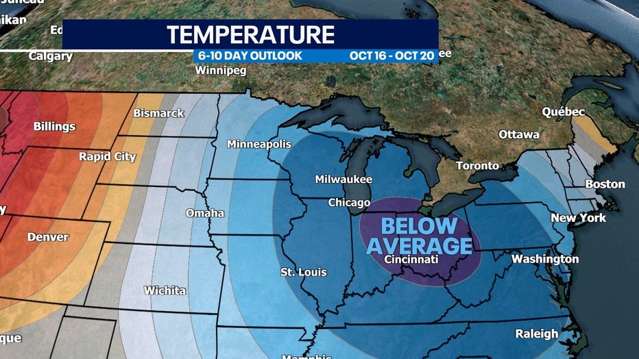 We don't have to go out that far to see below-average temperatures. Wednesday, Oct. 12 will be rainy and dreary followed by colder air that really arrives Thursday, Oct. 13 and doesn't let up in the foreseeable future.