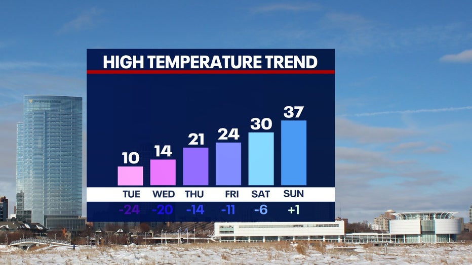 Slightly warmer, but still below average, temperatures will return by the end of the week in the 20s.