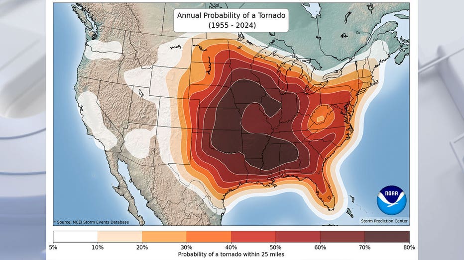The National Centers for Environmental Information (NCEI) and Storm Prediction Center (SPC) released the probability of these events occurring within 25 miles of any location based on historical data.
