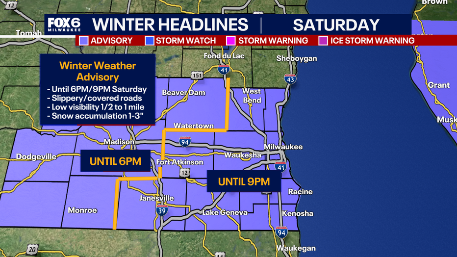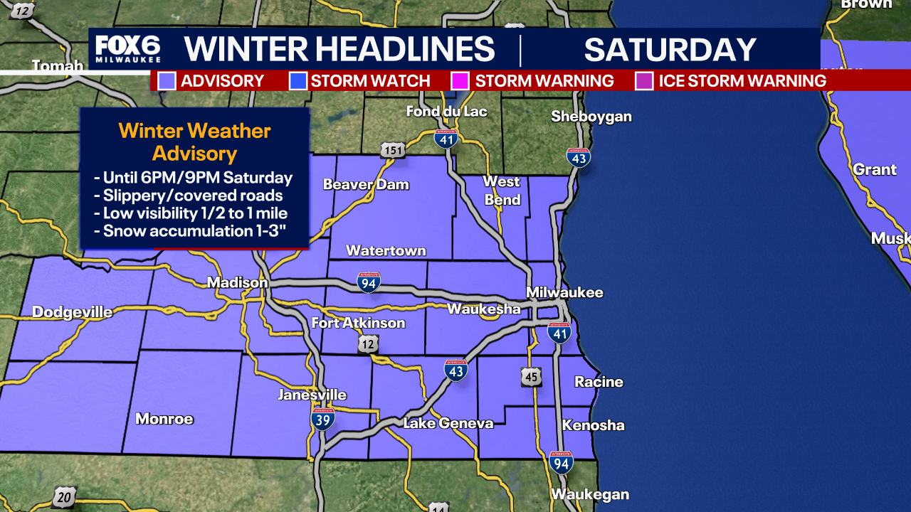 MILWAUKEE - The National Weather Service issued a winter weather advisory for southeast Wisconsin until 6 p.m. Saturday, Jan. 17 for Dodge County and west into southern Wisconsin, and until 9 p.m. for Jefferson, Rock, Walworth, Racine, Kenosha, Waukesha, Milwaukee, Washington, and Ozaukee Counties until 9 p.m.